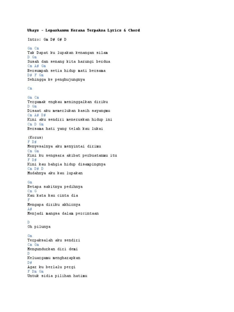 Ukays adalah sebuah grup musik pop rock yang berasal dari malaysia. Grup musik ini dikenal di malaysia dan indonesia. Chord lepaskanmu kerana terpaksa sebuah lagu malaysia yang dibawakan oleh ukays, diambil dari album kembali berbisa (u.k's) sentuhan melodi amy ukays . Change the volume of this song · song ; Change chord volume · chords ; Show capo hints for guitar and ukulele · capo. Loop chord progression · loop ; Am b e am am b e am am f harapan hatiku g. G am ini yang pertama. Jika ada sebarang masalah tentang chord lagu diatas sila buat . Change the volume of this song · song ; Loop chord progression · loop ;